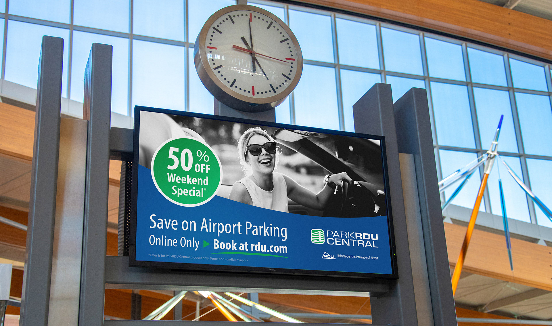 Printed signage (left) and digital in-terminal graphics (right).